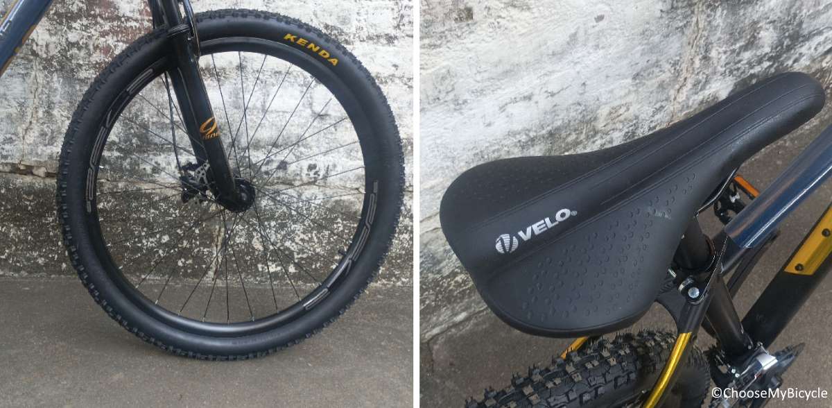 The Kenda MTB tires impressed us during the test ride. The 27.5” x 2.1” tires were heavily treaded with bulky buttons which covered the edges as well. These tires were fast rolling on flatter surfaces and could handle rough patches with ease.The stock Trail specific saddle was wide with enough cushioning.