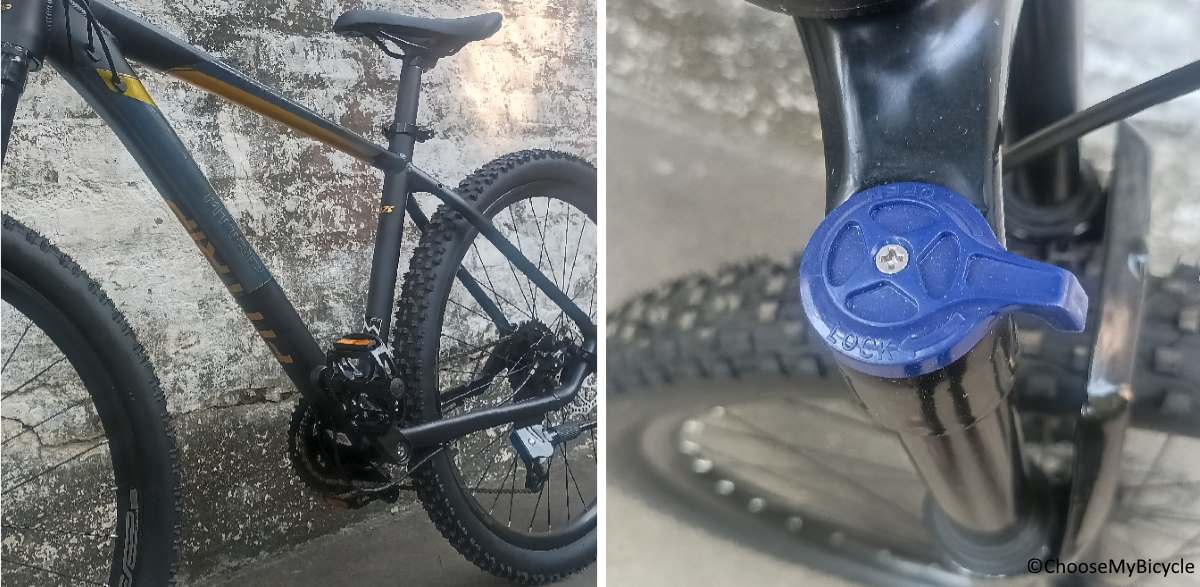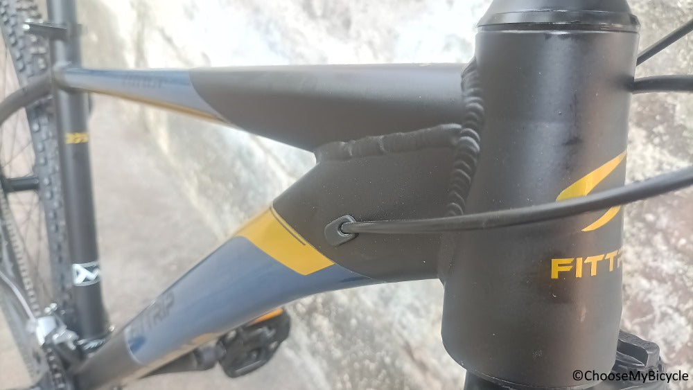 The Fittrip Niner 27.5 which we test rode came in a Black primary colour on the frame with Gold as the secondary colour for graphics. The matte finish paint job along with gloss decals definitely enhanced the colour scheme to make it look shining. The internal cable routing made the Bicycle look neat and the colour coordinated rims and suspension fork made it look aesthetic.
