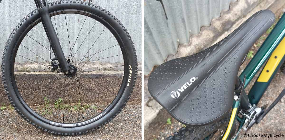 The Kenda MTB tires impressed us during the test ride. The 29” x 2.1” tires were heavily treaded with bulky buttons which covered the edges as well. These tires were fast rolling on flatter surfaces and could handle rough patches with ease.The stock Trail specific saddle was wide with enough cushioning.