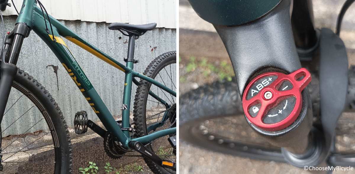 During the test ride the stock front suspension fork with its 100mm travel worked well both on harsh urban roads and rough trails.