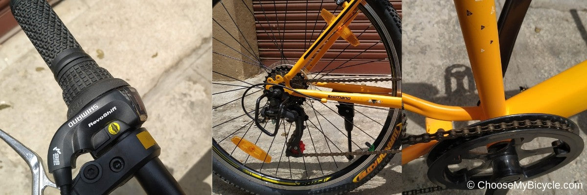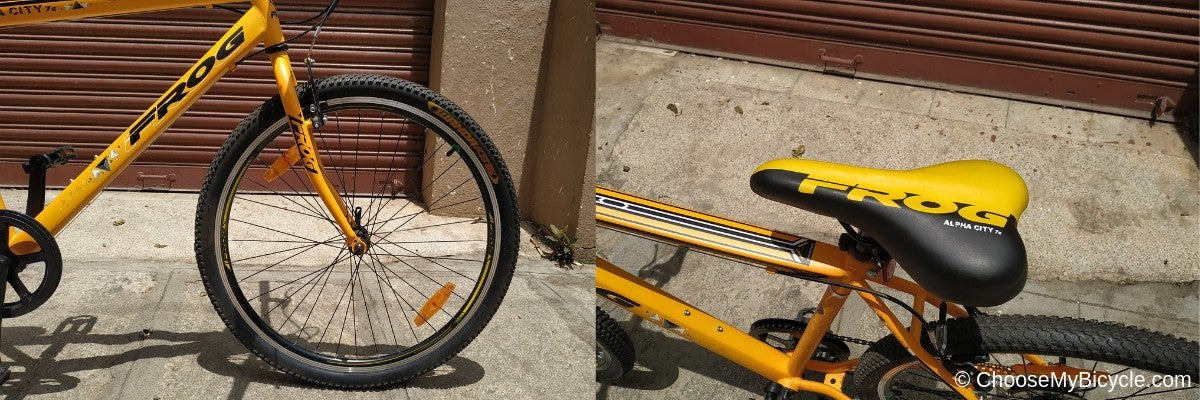 The Frog Alphacity 7S 26" has been designed keeping simplicity and the aesthetic appeal of a single bright colour with minimal decal work. The welding on the edges of the frame looked simple and neat. The bicycle we test rode came in a bright Yellow with simple Black decals and branding. This bicycle is available in two colour options - Yellow and Blue.
