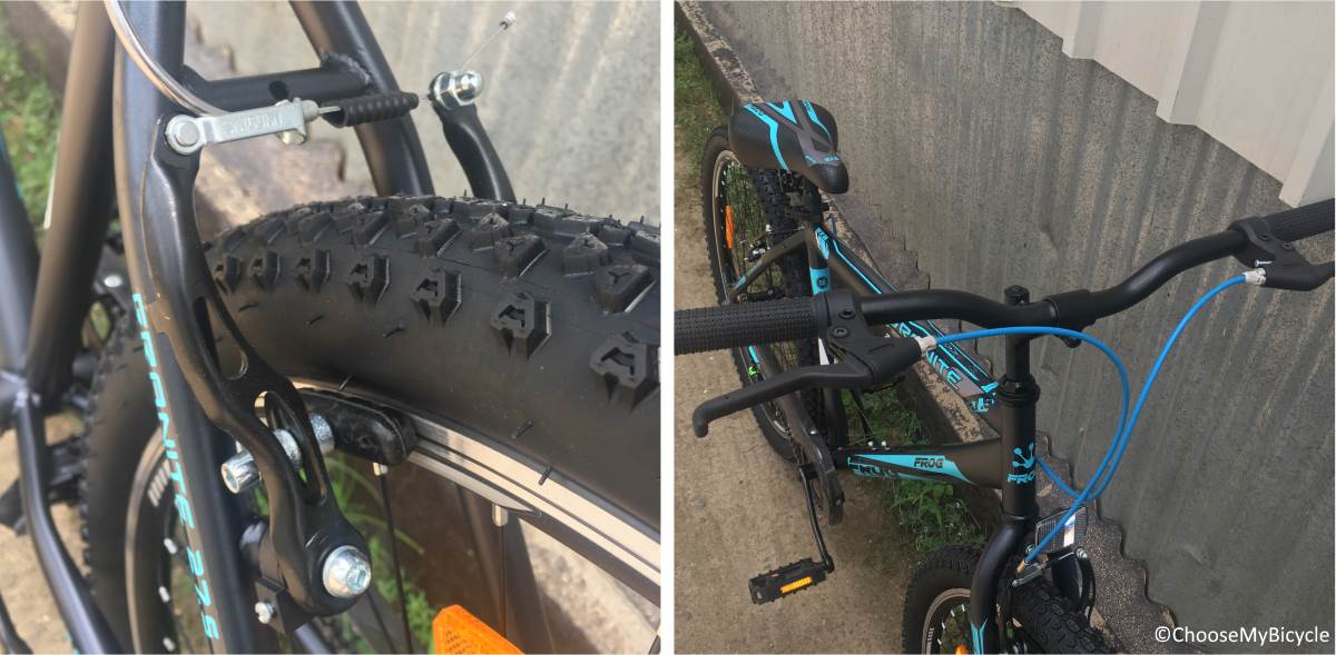 The Frog Granite 27.5"" comes equipped with ‘Saigun’ branded V-brakes at the front and rear that offer adequate stopping power for city use. The brakes were powerful and strong while tested. The brake cables are colour-coded with the overall colour scheme of the bicycle.The handlebar on the Frog Granite 27.5"" is wide enough to ensure a comfortable upright riding position. The width of the handlebar allows for superior control and maneuverability in crowded riding conditions. The handlebar grips felt slightly hard while on the test ride.