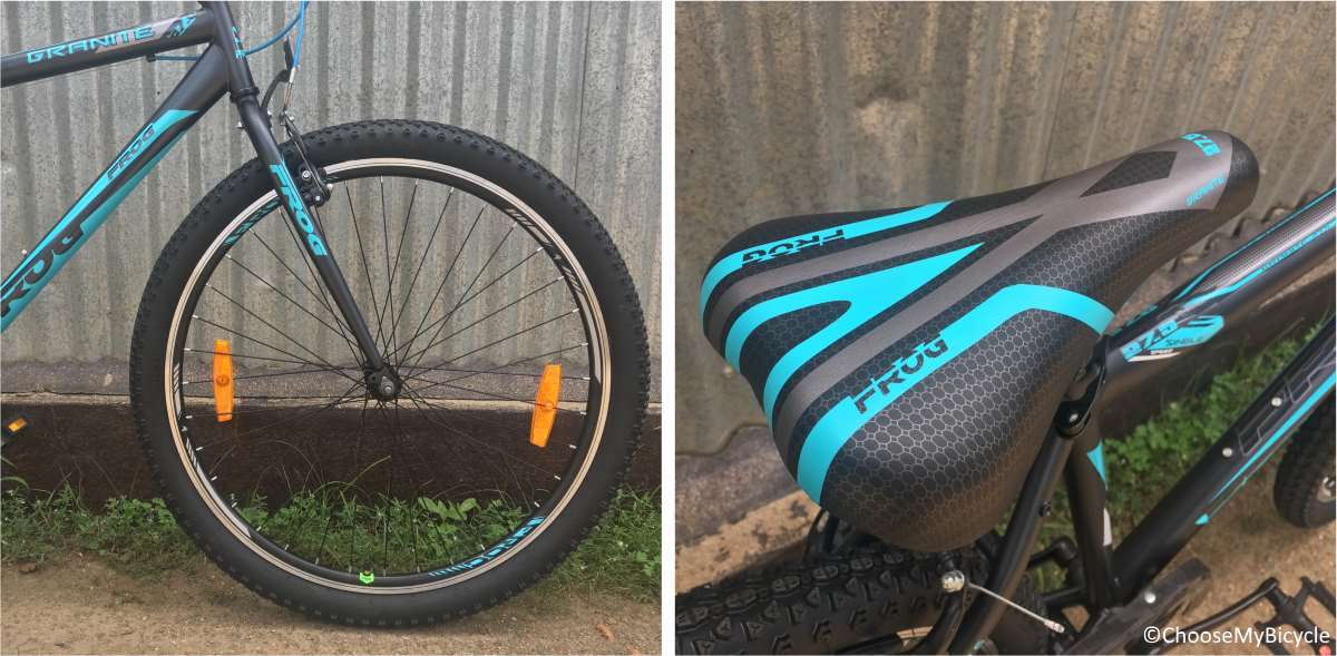 The 27.5’’ x 2.125’’ tires on the Frog Granite 27.5” were heavily treaded to generate a lot of traction on rough surfaces. The 27.5” circumference made it easy to ride over rough and smooth urban roads. The stock saddle was wide and had enough cushioning to keep the rider comfortable on bumpy rides.