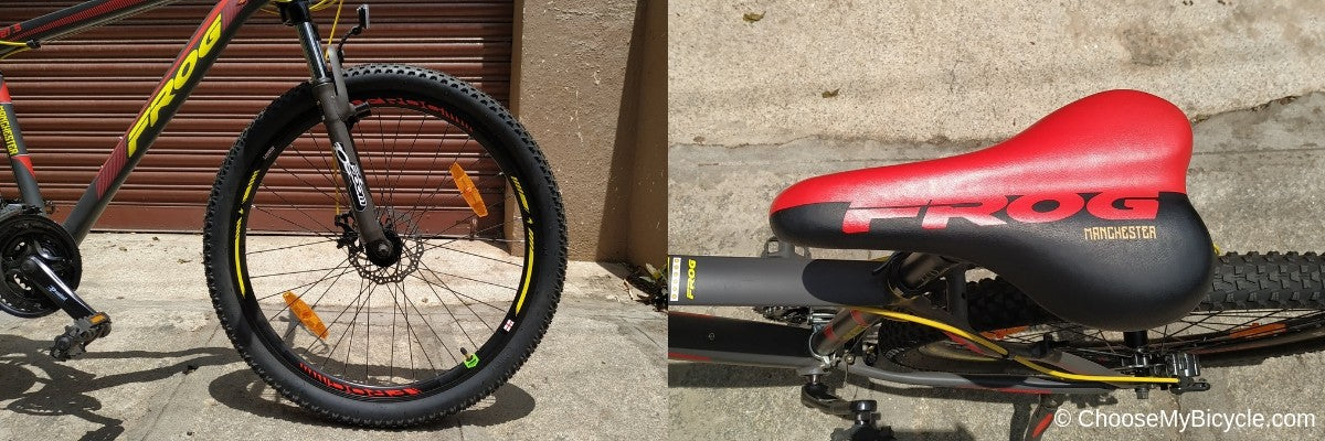 The Frog Manchester 27.5"" rolls on a pair of 27.5"" x 2.2” tires that are attached to Alloy double wall rims. The tires are well treaded, providing additional stability and grip when on uneven surfaces. When tested on a smooth surface, the tires were fast rolling with enough traction to provide stability in wet riding conditions and on turns. The biggest advantage with 27.5” wheels is the ease of handling the bicycle on both on-road and off-road riding conditions. Only the front wheel has a Quick Release option, which could be slightly time consuming when tackling a puncture while on a ride (if on the rear tire). Though, I would not view this as a significant hindrance given the specs and price point of this bicycle. The Frog Saddle that comes on this bicycle is wide and comfortable. When on the test ride, we found the saddle to be extremely comfortable, without any unnecessary bulk. The seatpost has a Quick Release, which is beneficial to adjust the saddle height while on the go. The saddle on this bicycle is colour coded with the bicycle, and is a bright and bold red. The overall ride quality of this bicycle was pleasant and satisfactory.