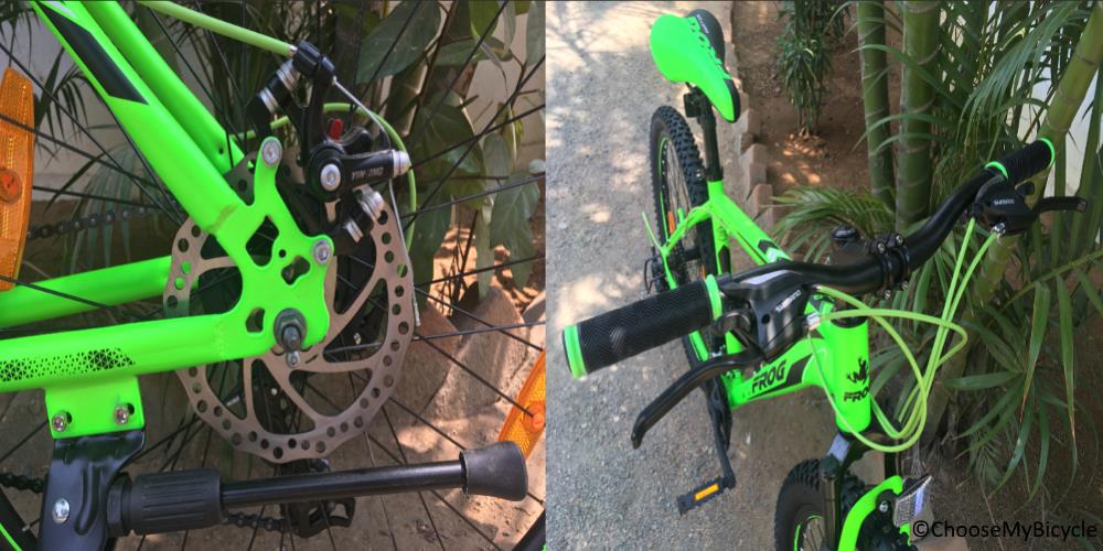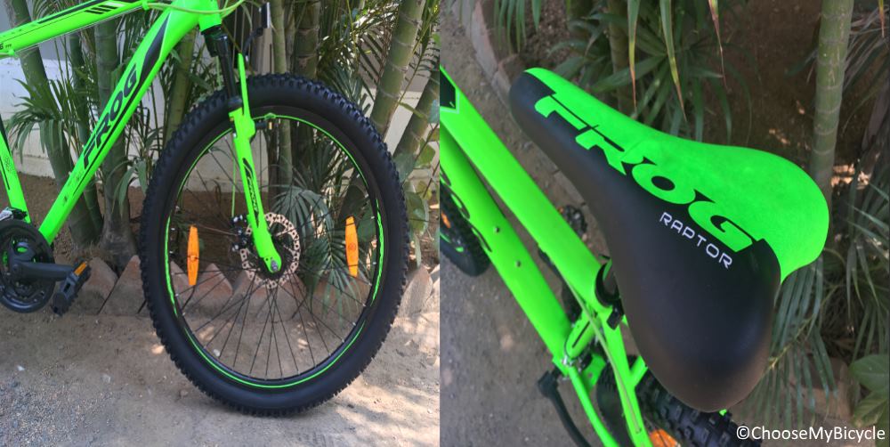 The Raptor from Frog which I test rode came in a bright Neon Green as the primary colour with Black as the secondary colour for the graphics and text. The Black/Green saddle with a huge Frog text is definitely eye catching. The matte finish paint job was top notch in quality. The Green brake and gear cables were a nice touch.