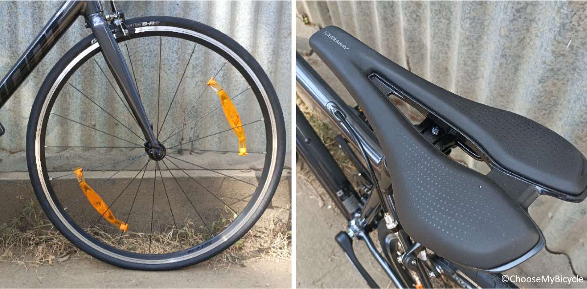 The Contend 3 (2022) rolls on a pair of stock Giant S-R3 AC 7x28C slick tires. These tires use a single compound which provides good grip during testing. These tires have a light tread pattern at the edge which helps in traction on wet roads and on turns as well.The Giant Contact saddle has an ergonomic design with the perfect amount of padding making it ideal for long distance rides.