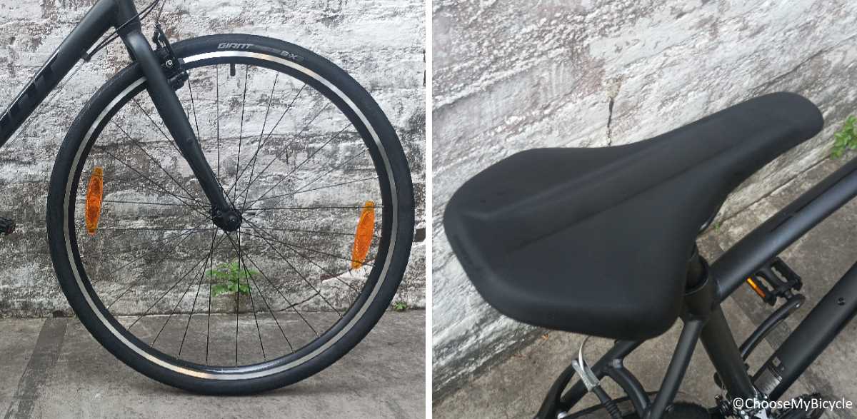 The 7c wheels on the Escape 3 (2022) offer a Road Bicycle rolling speed and efficiency. All models in the range feature Double Wall Aluminium Alloy rims so they are strong enough to take a pounding on the road day-after-day. The stock Giant S-X3 tires are wider than you get on a drop bar Road Bicycle so they offer a little more cushioning for a smoother ride on uneven road surfaces. These 7x38C S-X tires feature a tread pattern that offers much better traction in the wet than simple slick tires alongside puncture protection to significantly reduce the chances of a flat.The Giant Connect Comfort Saddle was ergonomically designed and had a lot of cushioning to keep the rider sore free.