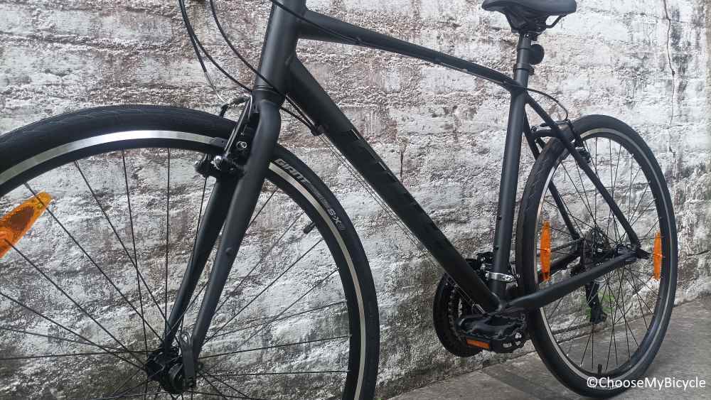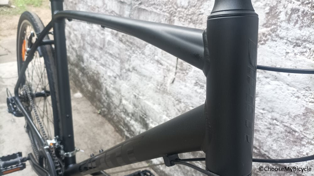 The Escape 3 (2022) which we test rode came in a full Metallic Black colour frame with Gloss Black as the secondary colour for graphics. The matte finish paint job quality was top notch and made the frame look smooth. The thin seat stays and chain stays made the Bicycle look sleek.
