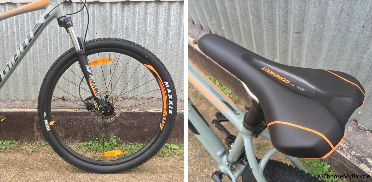 The Maxxis Ikon MTB tires impressed during the test ride. The 29” x 2.2” tires were heavily treaded with bulky buttons, which covered the edges as well. These tires can handle both wet and dry trails with ease. The Giant Connect upright saddle is wide with enough cushioning to keep the rider comfortable while out on the trails.