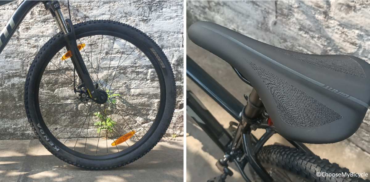 The Kenda branded Booster MTB tires impressed during the test ride. The 29” x 2.2” tires were heavily treaded with bulky buttons and covered the edges as well. These tires were fast rolling on flatter surfaces and could handle rough patches with ease.The Giant upright saddle is wide with enough cushioning for a comfortable ride on trails.