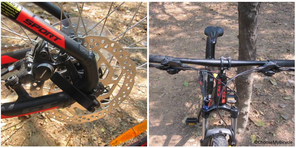 The GT Avalanche Sport comes equipped with Shimano M315 hydraulic disc brakes. The braking performance was responsive and crisp. While on the test ride I felt that both feathered braking as well as sudden braking felt controlled and super stable. This is something worth mentioning especially when looking at the bicycle from a downhill/ trail capable point of view. The Shimano M315 Brake Levers required two to three fingers to operate and felt sturdy and strong. This bicycle comes with a 68mm Alloy flat handlebar. The width of the handlebar enables a comfortable, ‘open-chested’ riding position. Additionally, a wide, flat handlebar ensures added control, stability and maneuverability. The grips on the handlebar exuded comfort with the perfect amount of cushioning. The placement of the brake levers and the shifters on the handlebar were comfortable and well within reach.