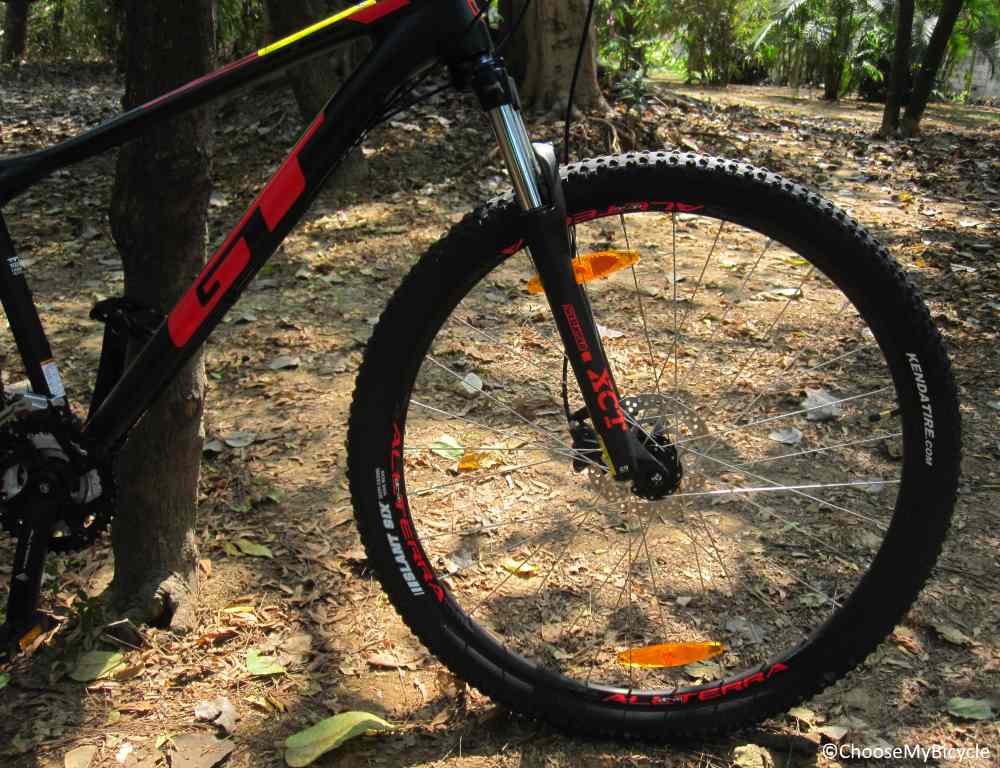 The GT Avalanche Sport comes equipped with a pair of All Terra Cypher 29” x 2.1” tires which are attached to All Terra rims. The treading on the tires ensured stability while cornering, even on rather sharp turns. Additionally, the spacing of the treading ensures that the bicycle will be stable and with enough traction to handle wet and slippery riding conditions. The stability offered by these tires are great for intermediate - intense trails. The wheels on this bicycle come with a Quick Release option.The GT Avalanche Sport comes equipped with an All Terra MTB Saddle. I found that the saddle was comfortable while on relatively less rugged trails and paths, however it could do with more cushioning to enable comfortable usage while riding on more intense trails that are sure to transfer vibrations to the rider's sit bones. The seat post comes with a Quick Release option to adjust the seat height with ease.