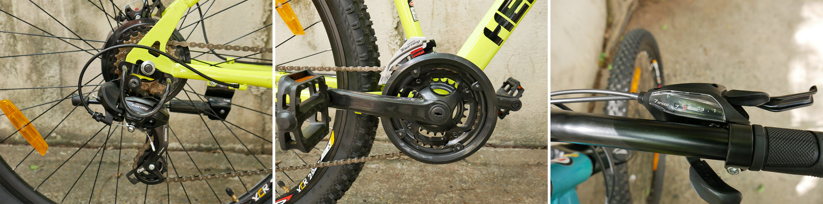 Blunt gets a 3x7 gear ratio. The crank set is made inhouse at Hero cycles, it is made of steel and the crank arm is over moulded with plastic which improves the aesthetics. The front and rear derailleur are from Shimano and are Tourney series which are entry level. The shifter is basic thumb and click shifters which work well. The gear ratio provided here is sufficient for day to day use and even slight off-roading.