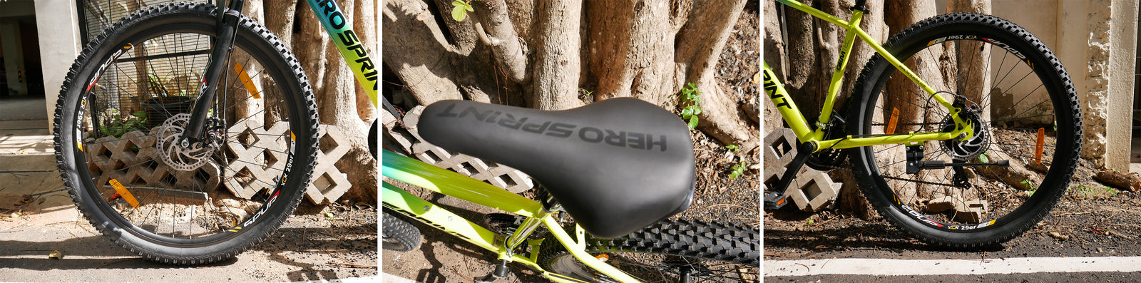 Hero Blunt comes in very attractive colour pattern of teal blue fading into lemon yellow. A bold decal of HERO SPRINT on bottom tube and GEMTech on the seat tube is seen. The bike has a very good stance and looks stylish. The taper down top-tube is suitable for young adults to easily get on a off the bike. The 29-inch wheels on this fame gives a SUV kind of feel for the cycle. It also comes with 26 and 27.5-inch wheel set, which makes it adaptable option for various height groups. Its good to see internal cable routing on a bike at this price point, this gives the bike a clean look.