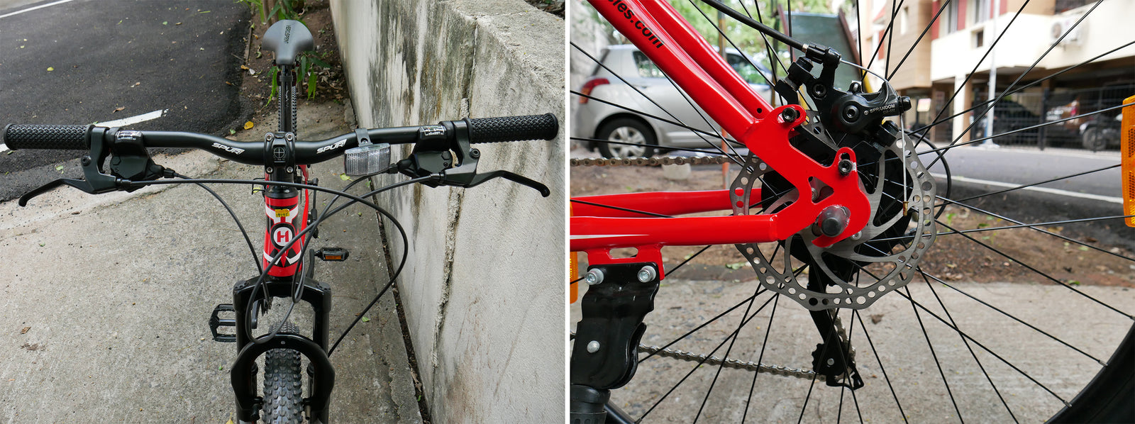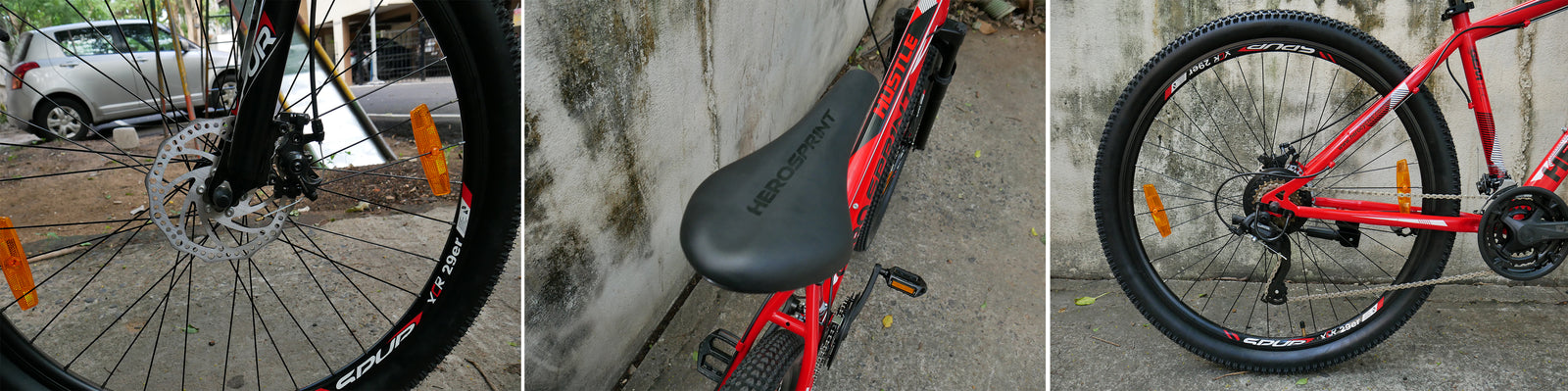 Hero Hustle comes in bold red colour with little white and black accents. A bold decal of HERO SPRINT on bottom tube and GEM-Tech on the seat tube is seen. The bike has a good proportion and looks solid. The taper down top-tube is suitable for young adults to easily get on and off the bike. The bike also comes with 26 and 27.5-inch wheel set, which makes it adaptable option for various height groups. This bike is also available as single speed option. The open cable routing felt a little clunky, while riding making metallic noise while going over bumps.