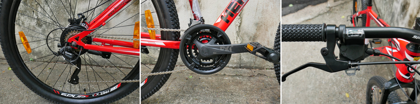 Hustle gets a 3x7, 21 speed gearing system also available in single speed. The PXR cranks are from Amar ergo sys. The front and rear derailleur are from Microshift. The shifter is basic thumb and click shifters which are also Microshift and works well. The gear ratio provided here is sufficient for day to day use and even slight off-roading.