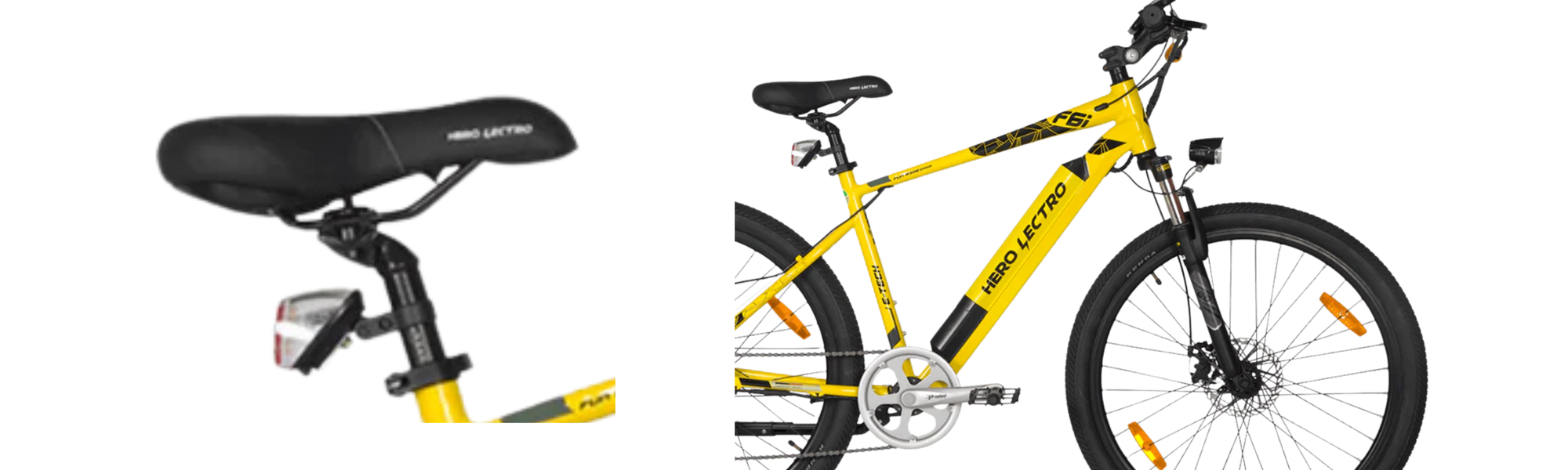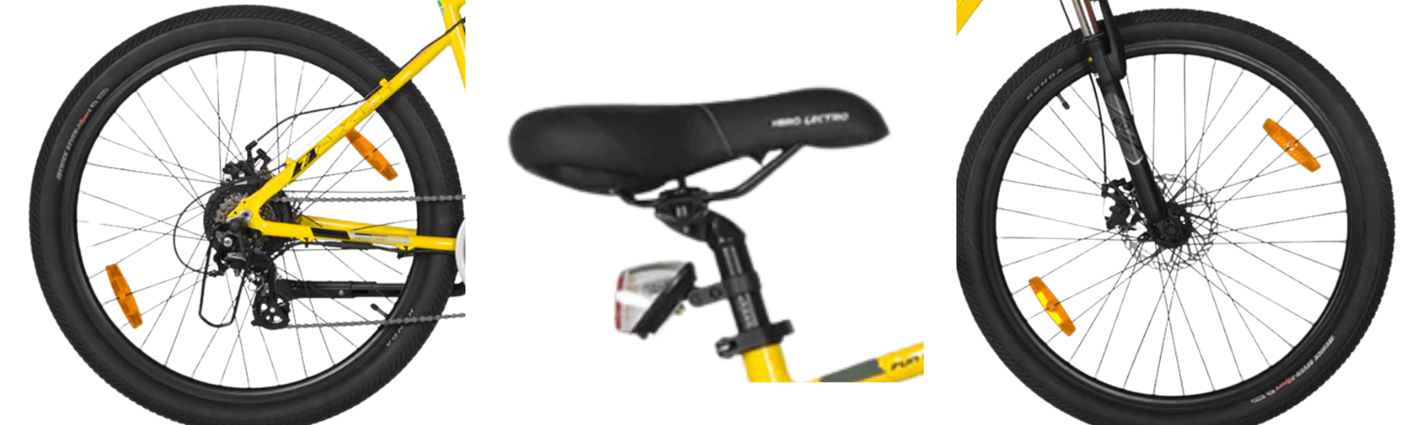 The Hero performance saddle provides a comfortable perch firm enough for pedaling efficiency yet cushioned for extended rides. Combined with the front suspension and wide tyres, it enhances overall comfort for longer commutes.