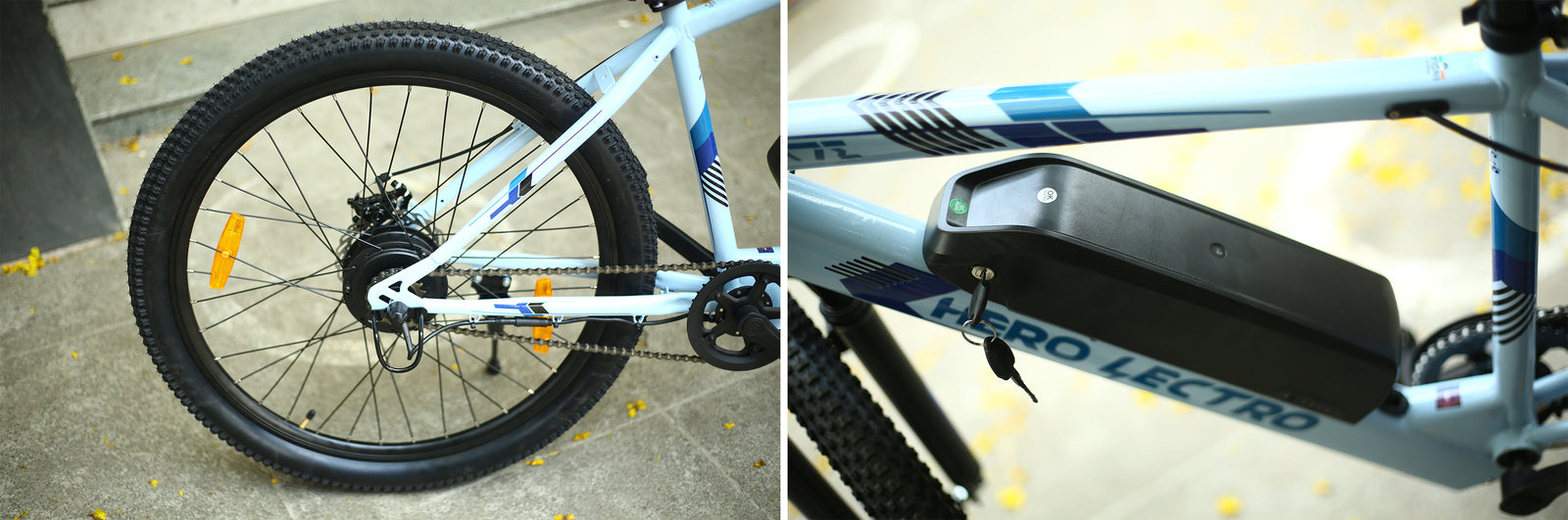 The 27.5" wheels with thick tires provide a smooth and comfortable ride on any terrain. With just a twist of the throttle, you can effortlessly cruise past traffic and reach your destination fresh and relaxed. Equipped with LED lights and a battery level indicator, it ensures your safety on the road even after dusk. Maintece-free and with no registration or license required, the H7 Sigma is an environment-friendly way to commute that saves you time and money on fuel costs every day. Key Ignition and 7.8 AH Detachable battery range up to 4 km for extra protection/safety unlike some other E-Bike. Giving the user Theft protection of E-bikeThus, 25 Watts BLDC Motor: H7 comes with a High Torque 25 Watts BLDC motor to give you the thrill of riding an E-cycle. The range can go up to 25 Km/hr as per Legal requirements. Comprises a detachable battery as a safety feature. The rear light is solar-powered for additional convenience
