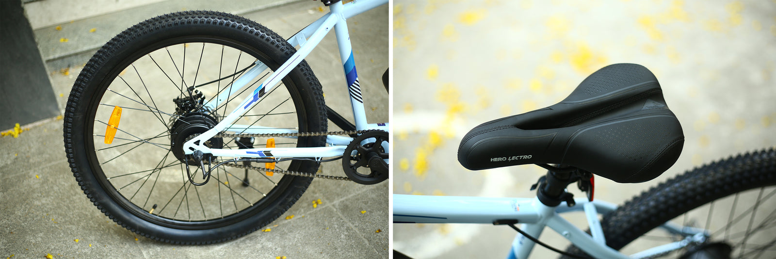 Huge 27.5-inch tires that are wider and have MTB treads, 8 blocks designed for enhanced grip and stability on various terrains. Wheels measure about 27.5 x 2.4 inches, providing a robust and durable option, thus suitable for city commuting and light off-road riding?. Compact SV (Schrader Valve) tubes prevent frequent punctures and easy air filling. 36H alloy double wall rim will help to reduce bike weight and rusting issues. MTB Tires offer superior grip and stability, making it suitable for various road conditions.The Saddle was a PU foam comfortable wide saddle that helps in longer-duration rides. This also gives the rider extra comfort