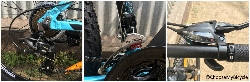 The Shimano Tourney 21-Speed derailleurs worked smoothly during the test ride and are ideal for urban roads and easy trails