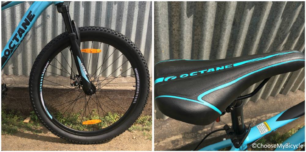 The Hero Octane Springbok rolled on a pair of DSI Small block 27.5” x 2.1” MTB tires. These MTB tires were heavily treaded and provided a lot of traction on both rough urban roads and flat trails. The stock Sport PU Saddle was ergonomically designed with a good design and grippy leather.