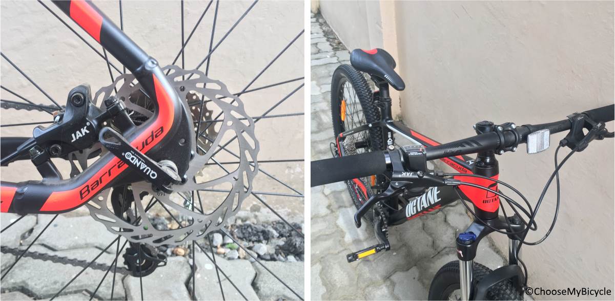 The JAK Hydraulic Disc brakes on this bicycle were as powerful brakes as it can get on a mid-level hardtail MTB. During the test ride, the brakes were powerful and felt balanced to use on both wet and dry conditions on both trails and rough urban roads.The 68mm Alloy MTB handlebar was lengthy and not the most comfortable if you are looking to commute with this bicycle. But they are perfectly suited for trail rides with drops and inclines.