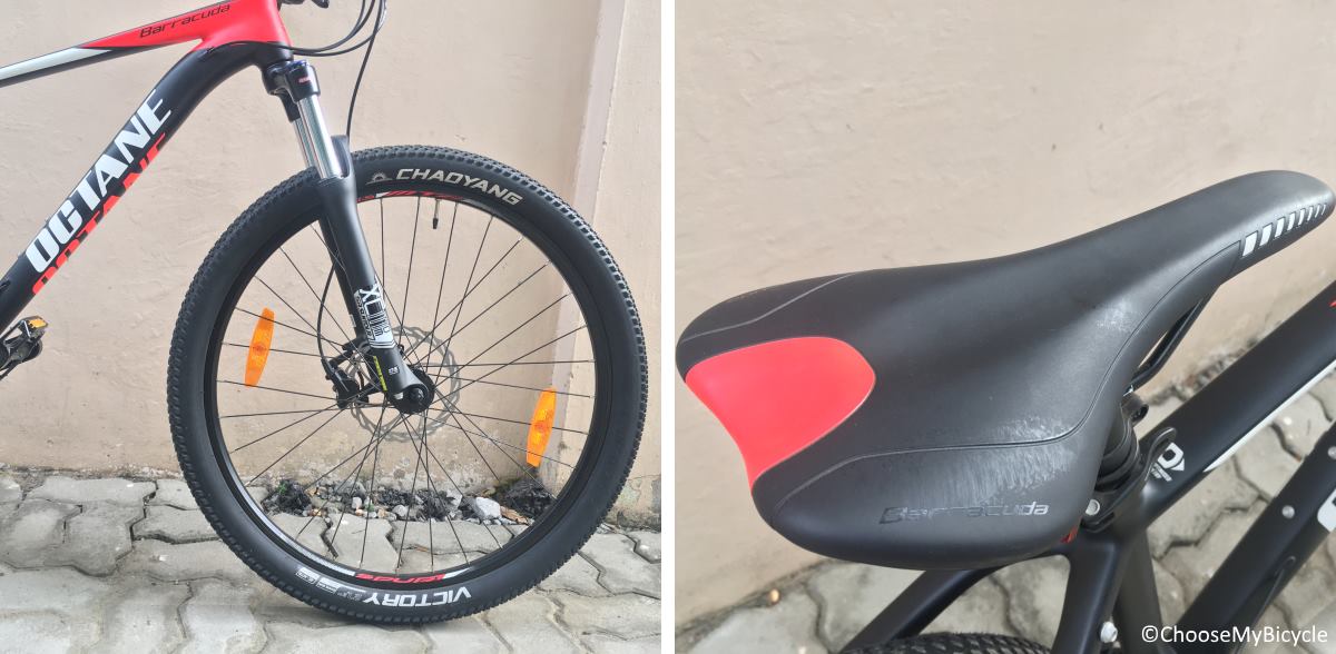 The Hero Octane Barracuda 27.5 is built around a Hardtail Alloy frame. The frame is strong but not too heavy for a MTB, which ensures that it can handle a lot of hard hitting from the surface. The frame is designed to be built taller from the ground up, giving larger ground clearance making it safer to ride over obstacles.The Suntour XCM HLO Suspension fork was smooth in functioning during the test ride with a large 1mm travel making sure that most of the vibrations of the surface are absorbed. The suspension lockout was easy to use and was useful when riding faster on flatter patches.