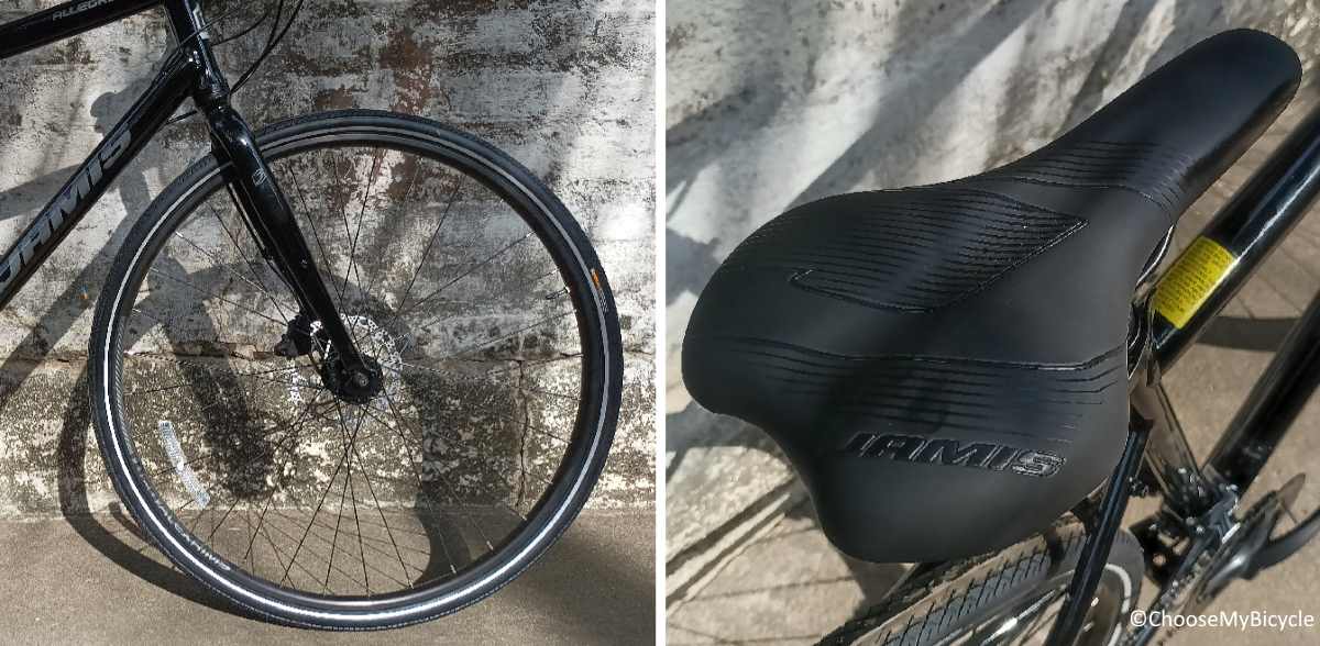The 7c wheels on the Allegro A2 offer a Road Bicycle rolling speed and efficiency. This Hybrid Bicycle features double wall aluminium alloy rims so they are strong enough to take a pounding on the road day-after-day. The Kenda Kwick tires are wider than you get on a drop bar Road Bicycle so they offer a little more cushioning for a smoother ride on uneven road surfaces. These Kenda tires feature a tread pattern that offers much better traction in the wet than simple slick tires alongside puncture protection to significantly reduce the chances of a flat.The Jamis stock Touring Comfort Saddle was ergonomically designed and had a lot of cushioning to keep the rider sore free.