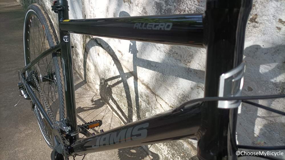 The Jamis Allegro A2 which we test rode came in a Black colour frame with Grey as the secondary colour for graphics. The gloss finish paint job quality was top notch and made the frame look shiny. The graphics and design were simple yet elegant. The thin seat stays and chain stays made the Bicycle look sleek.