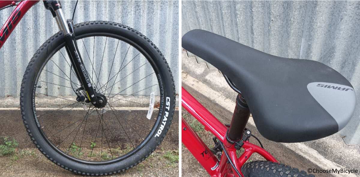 This Hardtail MTB rolls on a pair of CST Patrol 29” x 2.25” MTB tires. These tires on the Jamis Durango A1 are heavily treaded with bulky treads which cover the tires evenly. This makes sure fast cornering is safe on wet and muddy conditions.The stock MTB saddle is perfectly designed to make sure the rider is safe and sore free on a bumpy surfaces.