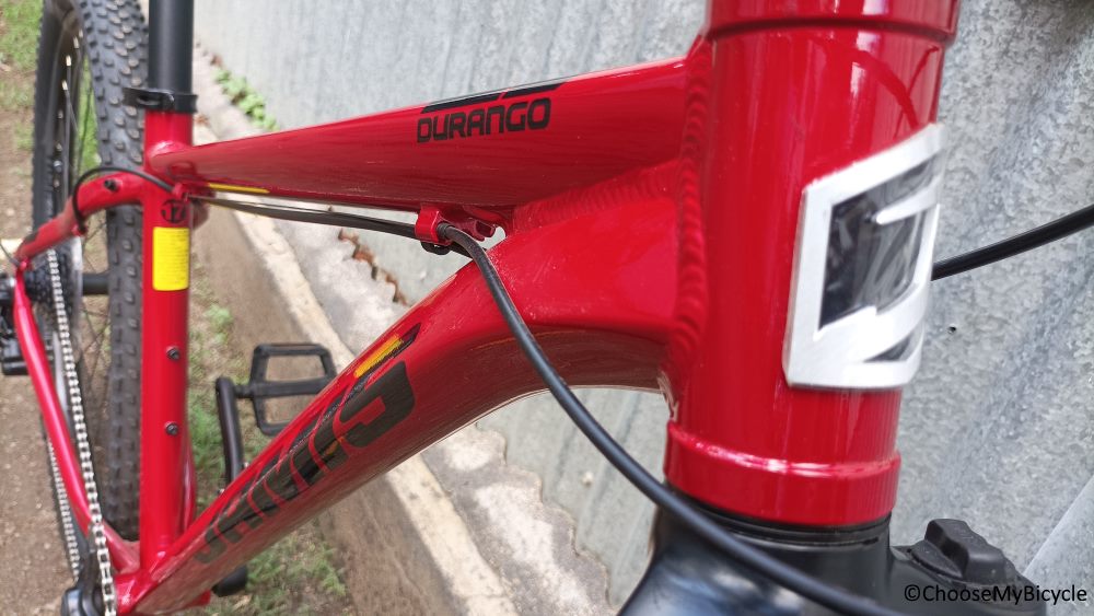 The Durango A1 which we test rode came in a full Garnet Red frame with Black graphics. The gloss finish paint job is of top quality and blends the colours used in a neat manner. The slanting top tube and the wide handlebar make this Bicycle look sporty and sleeker in design. The colour coded rims and suspension along with bulky treads on the tire make this MTB score high on aesthetics.