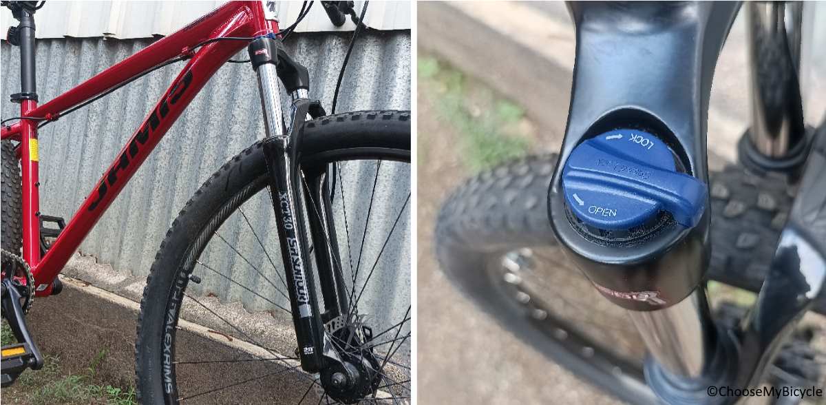 The Jamis Durango A1 is built on a strong yet lightweight 661 Alloy Hardtail frame. This frame is built to ride on flat to moderate trails and the roughest of urban roads. The slanted top tube allows for the rider to tuck in their knees during drops so as to balance the Bicycle. The tubes are welded smoothly and the Alloy material has been used in perfect proportion on parts of the frame, which could experience maximum impact from the surface of the trail.The SR Suntour XCT3 front suspension fork made a considerable difference in absorbing vibrations of the surface during the test ride. The suspension lock-out feature helped ride faster on flatter surfaces.