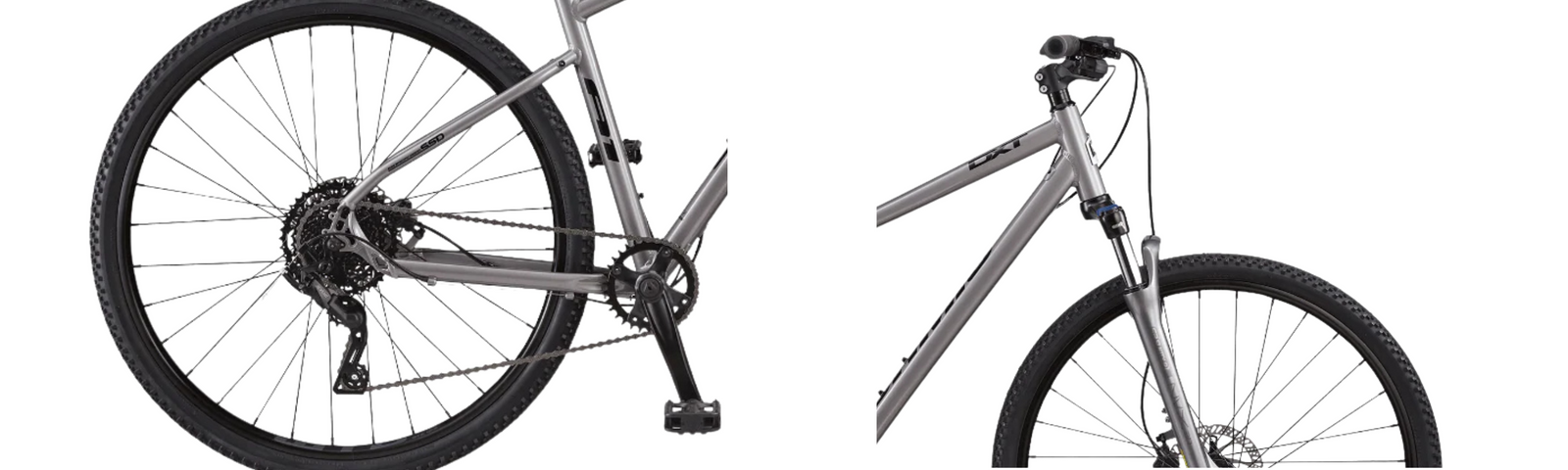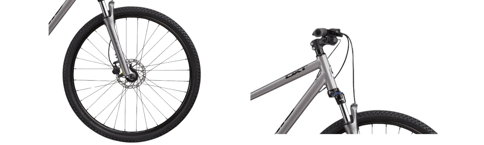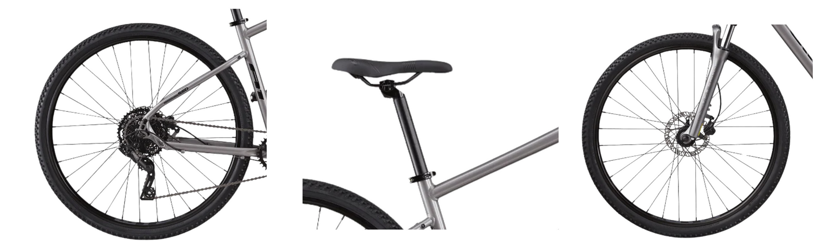 Rolling on robust 700c WTB STX i23 TCS double-wall rims with Joytec hubs and 32H stainless-steel spokes, this hybrid brings durability to the ride. Matched with CST Dual Sport 700×42c tires (per ChooseMyBicycle spec sheet), the setup strikes a solid balance between speed and traction. Saddle comfort is addressed with the