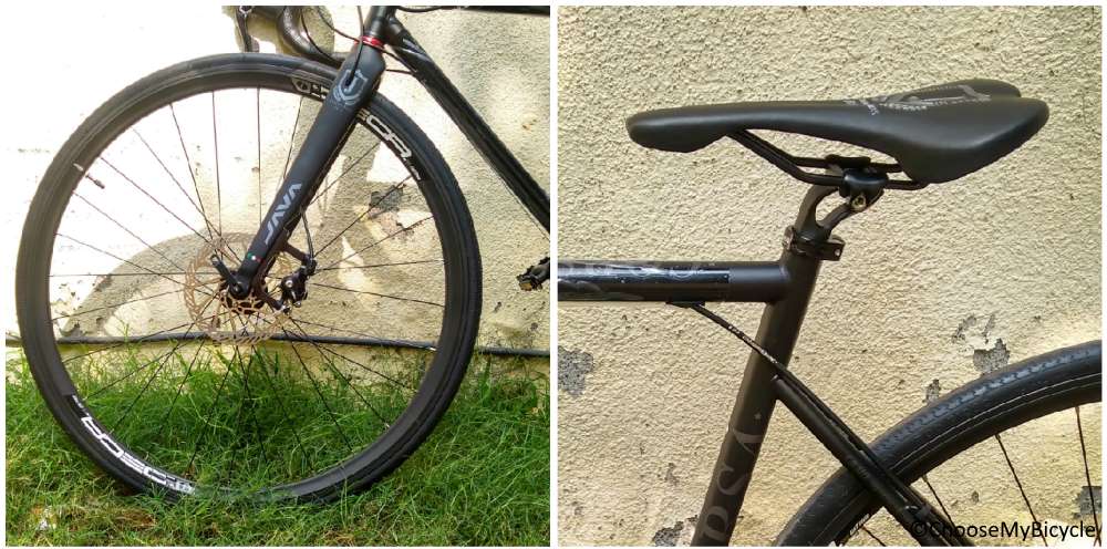 The Java Corsa is made using a cromoly steel frame. Cromoly steel is a kind of low alloy steel whose name is derived from a combination of the words “Chromium” and “Molybdenum” – two of the major alloying elements. Cromoly Steel frames have an excellent strength to weight ratio and are considerably stronger, sturdier and more durable than standard steel frames. Additionally, they also weigh lesser than tradional steel frames. The design of the tube ensures supreme performance on all kinds of terrain – tested on cobblestones, rough urban roads and smooth city roads. The performance across all terrains was impeccable. This bicycle comes equipped with a Carbon fork. The combination of a Carbon and Cromoly steel frame offers an ideal collaboration between the frame and fork. The fork absorbs shock felt from riding on cobblestones, and/or bumpy, rough terrain efficiently.