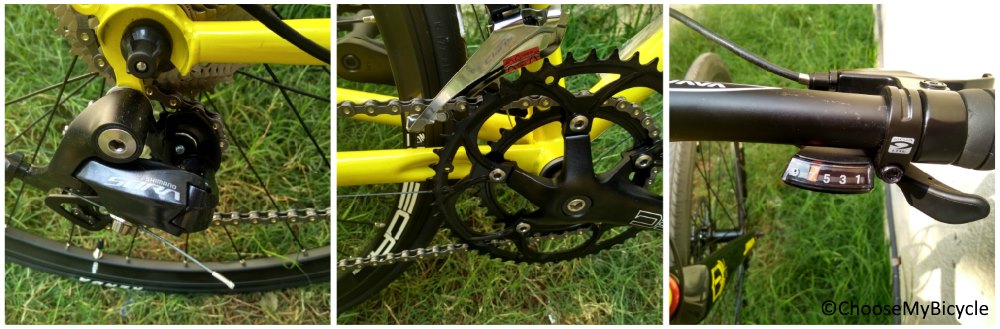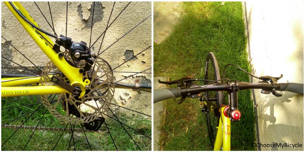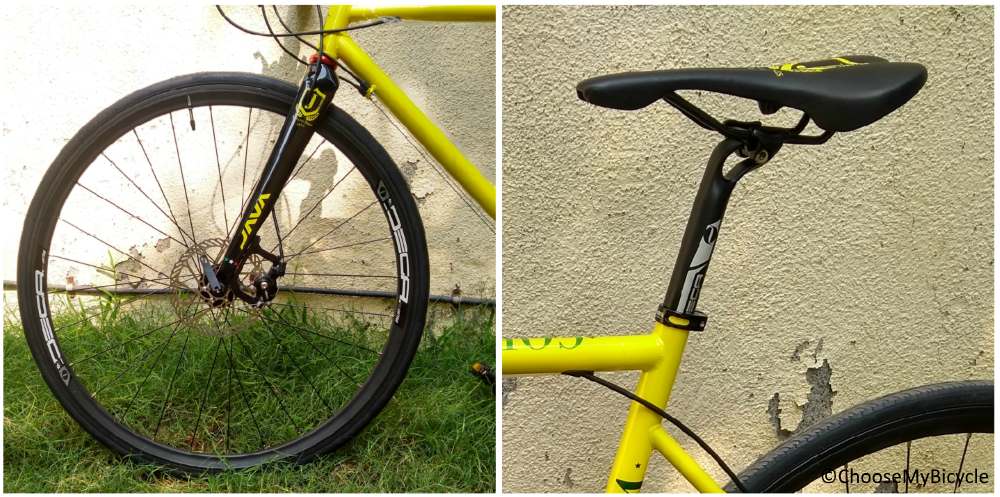 The Java Corsa Flatbar is a well-designed bicycle. It's designed keeping simplicity in mind. The bicycle has thin rounded tubing keeping it's overall look sleek and classical. The bicycle we test rode came in a primary colour bright yellow with simple bold branding in black. The branding on the frame of the bicycle is significant while not being overpowering. This bicycle is available in three colour options – Black, Yellow and Titanium.