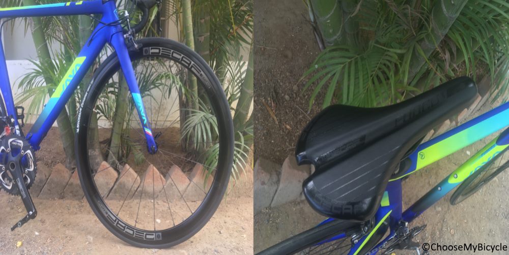 Java's designs are always futuristic with smooth welding of the tubes. The bicycle I test rode came in a Blue matte finish frame with Yellow and a lighter shade of Blue for graphics and text. The flat aero tube profiles along with the bladed carbon fork and an integrated seat tube clamp immensely enhanced the aesthetics of this bicycle.