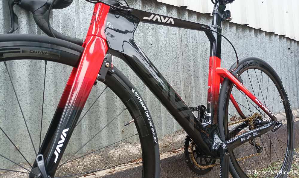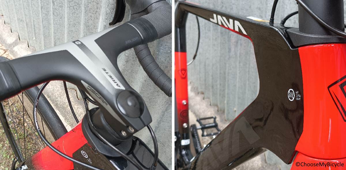 Java's designs are cutting edge and futuristic with smooth welding of the tubes. The Bicycle I test rode came with a Black gloss finish frame with Red as the secondary colour for graphics and text. The flat aero tube profiles along with the bladed Carbon fork and an integrated seat tube clamp immensely enhanced the aesthetics of this Bicycle.