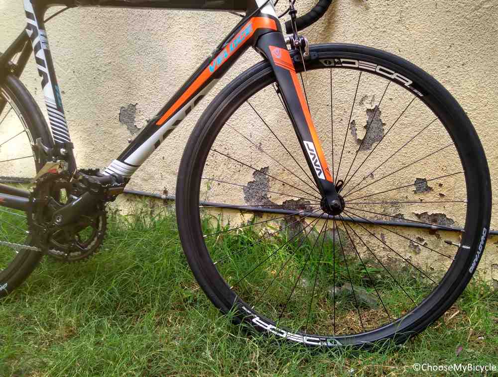 The Java Veloce 2 comes equipped with a Shimano Sora Rear Derailleur and a Shimano Claris Front Derailleur. This 18-Speed bicycle is a mean machine when on the road, tackling climbs and flat roads with ease. The shifting was lag-free, it should be considering it is after all Shimano Sora enabled – which at this price point is impressive. The 18-Speed shifting is controlled by Shimano Sora Shifters which require the slightest click to shift.