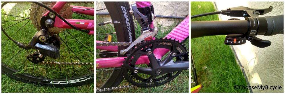 The Java Veloce Flatbar is a well-designed bicycle. The smooth welding on the frame joints adds to the overall aesthetics of this bicycle. The bicycle we test rode came in a primary colour of purple with bright yellow decals. The branding on the frame of this bicycle is significant while not being overpowering. This bicycle is sure to make heads turn. This bicycle is available in two colour options – Purple/Yellow, and Blue/Pink.