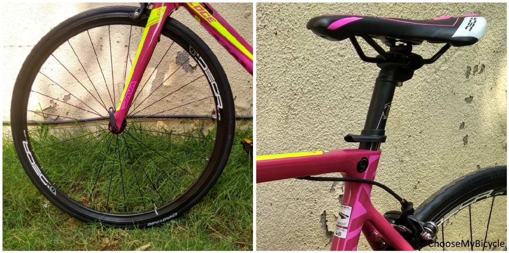 The Java Veloce Flatbar comes equipped with fast rolling and sleek 7x23C tires which are attached to Alloy Rims. The tires offered a smooth and fast ride. Cornering felt stable, allowing for crisp sharp turns while being stable. This bicycle comes equipped with a Deca Saddle. The saddle offered a level of support and cushioning that is well suited to a rider on faster, short-distance rides just as much as those riding a century. A wider saddle would have helped, especially for long-distance rides, however, this does not affect the overall performance of this bicycle.