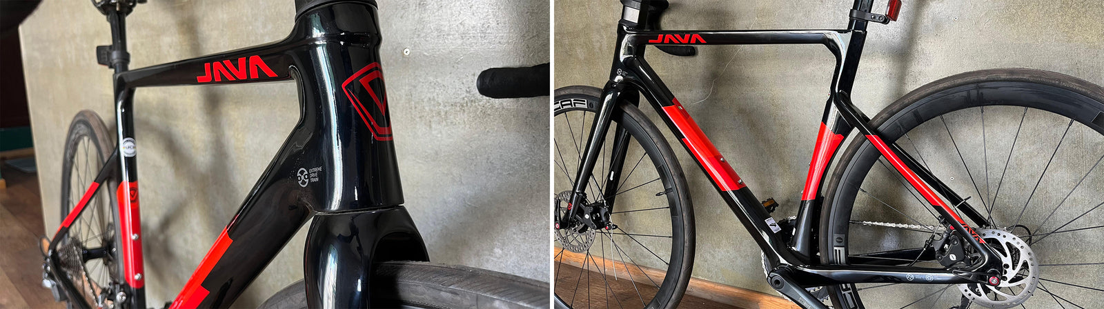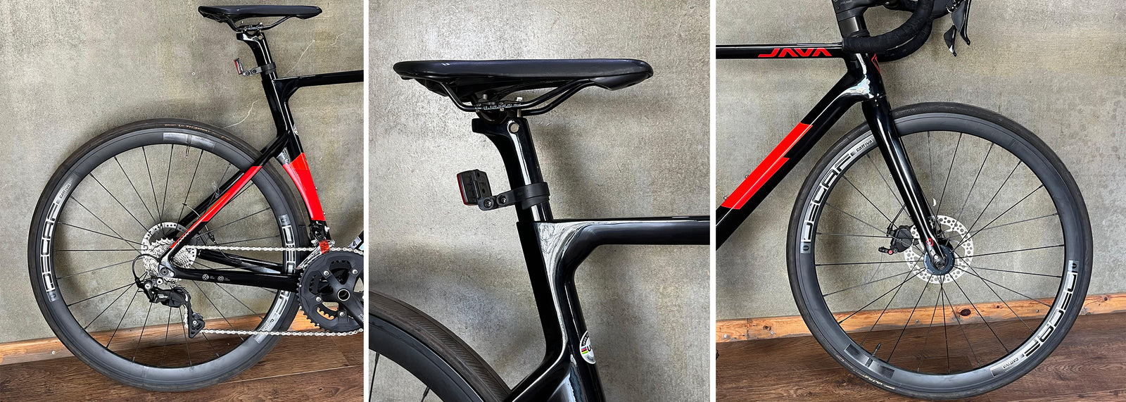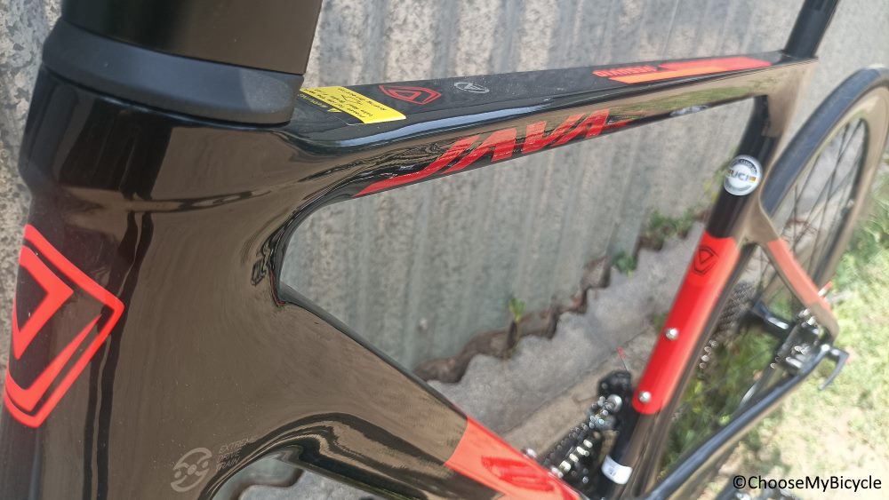 Java's designs are cutting edge and futuristic with smooth welding of the tubes. The Road Bicycle I test rode came in a Black gloss finish frame with Red as the secondary colour for graphics and text. The flat aero tube profiles along with the bladed Carbon fork and an integrated seat tube clamp immensely enhanced the aesthetics of this Road Bike.