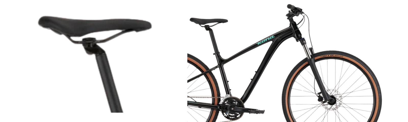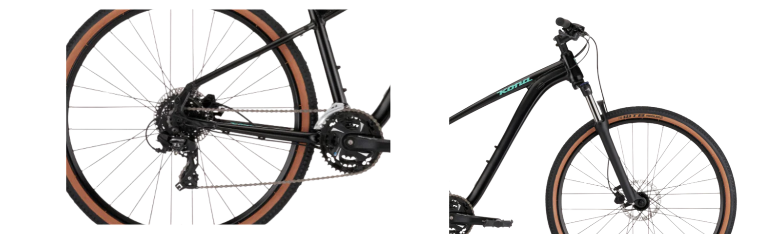 Double-wall alloy wheels enhance durability and strength. Formula hubs provide smooth rolling performance. WTB Riddler tyres balance speed with off-road grip. Kona Crosstrail saddle improves ergonomic comfort. Wheel setup supports stability on mixed terrain. Built for reliable everyday performance.