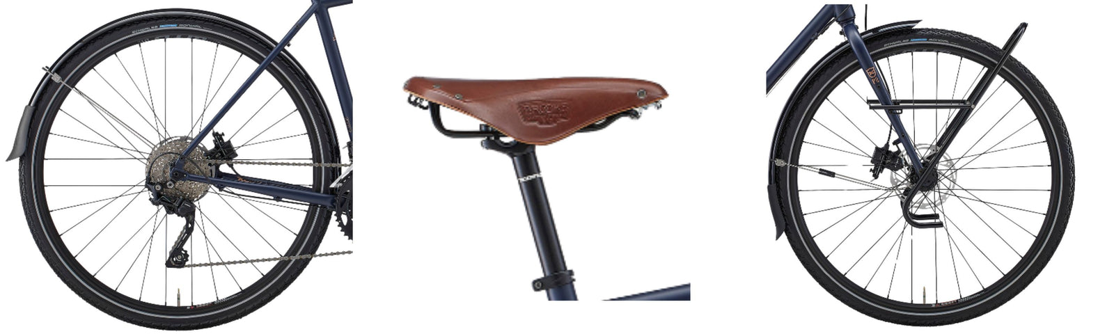 The 700C wheels are built strong to handle heavy loads without flex. The Brooks saddle molds to the rider over time, becoming more comfortable with every mile.