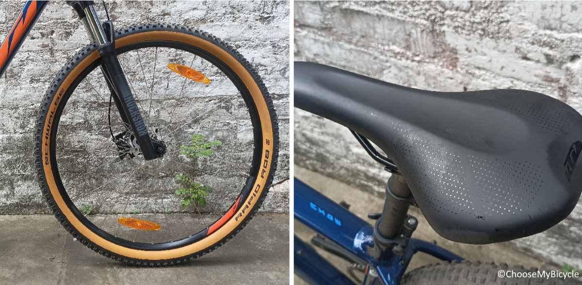 The Schwalbe 29” x 2.25” tires had bulky treads and rolls fast