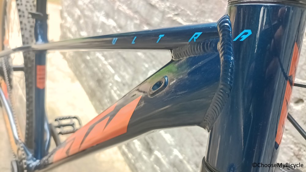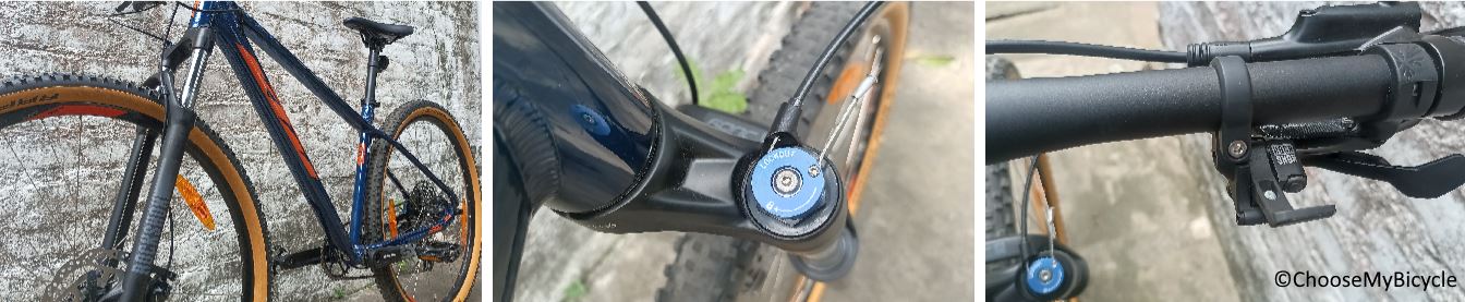 This Hardtail Performance MTB which we test rode came in a Dark Blue primary colour with Orange in a few places as the secondary colour. The gloss finish paint job was top notch in quality. The internal cable routing for the derailleur and brake cables made the Bicycle look neat and organized.