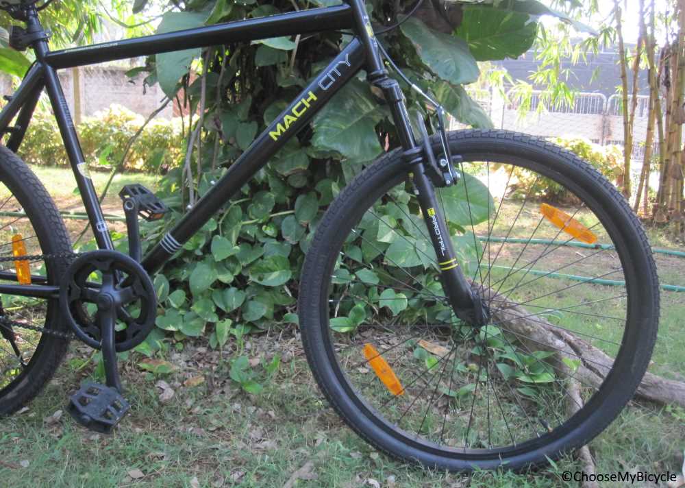 The Mach City iBike Hardtail made its debut last year. This front suspension city bicycle is built on a steel frame. The frame is stiff and has decent response on flat city roads. The frame geometry is simple and standard giving the rider a comfortable ride posture. HT in the name of this bicycle literally translates to Hard Tail, which is has a front suspension fork. The travel on this suspension fork was very minimal and was just enough to absorb a little bit of vibration off speed breakers and bumps on city roads.