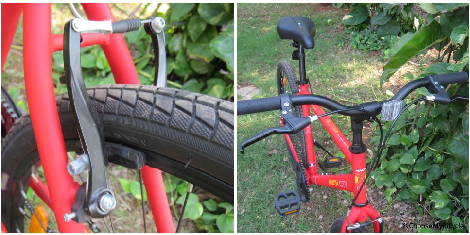 This City bicycle comes equipped with V-brakes at the front and rear. These brakes were safe to use inside the city but lacked balance and felt draggy.The stock handlebar has been the same as the previous version. The steel handlebar curves from the middle and gives an upright riding posture to the rider. The grips felt a little hard and could have used little more cushioning.