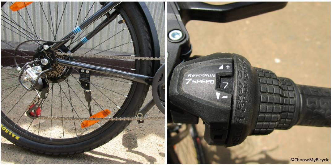 The Mach City iBike is a straightforward 7-Speed bicycle, with a Shimano Tourney rear derailleur. The shifting is controlled by Shimano Revo grip shifters. The gearing componentry used is expected given its price point. The shifters worked satisfactorily to allow for smooth shifting. However, there was a strain on the wrists while downshifting. The bicycle is ideal for city commuting and leisure riding. The bicycle could require extra efforts while using it on elevated areas in the city, like on flyovers or in cities with variable terrains.