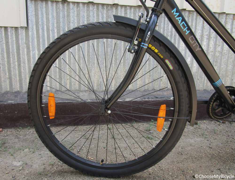 The 26'' x 1.95'' Ralson tires that come with the Mach City iBike W 7 Speed are sturdy and could possibly be why this bicycle can be used on simple trails apart from the city. The front wheel is fitted with a quick release, which makes removing and putting the wheel back on much simpler. The thicker width of the tires makes the bicycle more stable and balanced on bumpy surfaces.This bicycle comes equipped with a comfortable foam saddle that is wide enough to comfortably accommodate one's sit bones. Additionally, the seat post has a quick release option, making adjusting the height of the saddle easier on the go. The overall ride quality was smooth and favorable, especially considering the bicycle is aimed at city rides.