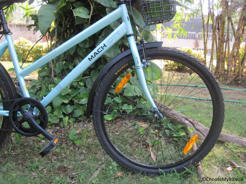 The Mach City iBike has been made using a traditional steel frame. While steel is known to be on the heavier side, the design of this bicycle and the welding on the frame contributes towards reducing the overall weight of this bicycle. The bicycle has a downward sloping top tube which makes it perfect for women riders. The geometry of the frame ensures a comfortable, upright riding position. Additionally, the women specific frame design enables easier mounting and dismounting. This bicycle comes equipped with a rigid fork. There is also a mounting provision for a single water bottle holder. In an upgrade this year, the bicycle comes equipped with a front basket, and front and rear mudguards that are made of good quality metal.